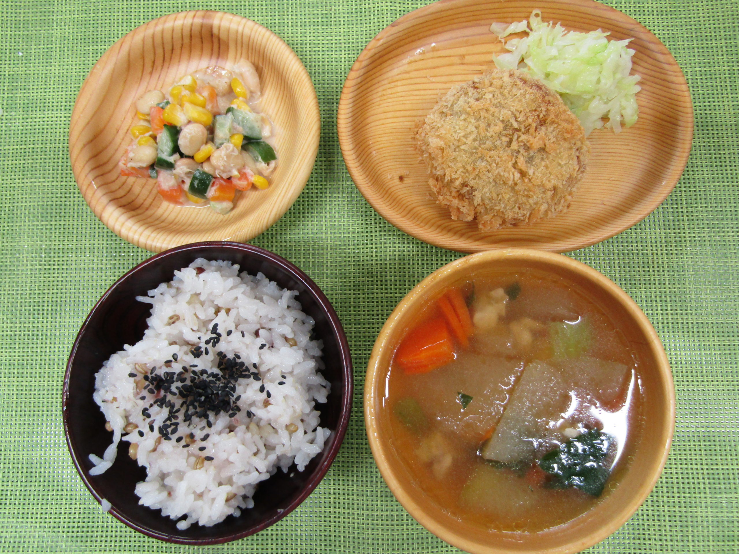 ≪昼食献立≫ 七穀ごはん 冬瓜のスープ さつま芋のコロッケ (付)千切りキャベツ 大豆のサラダ ≪おやつ≫ カレーうどん お茶