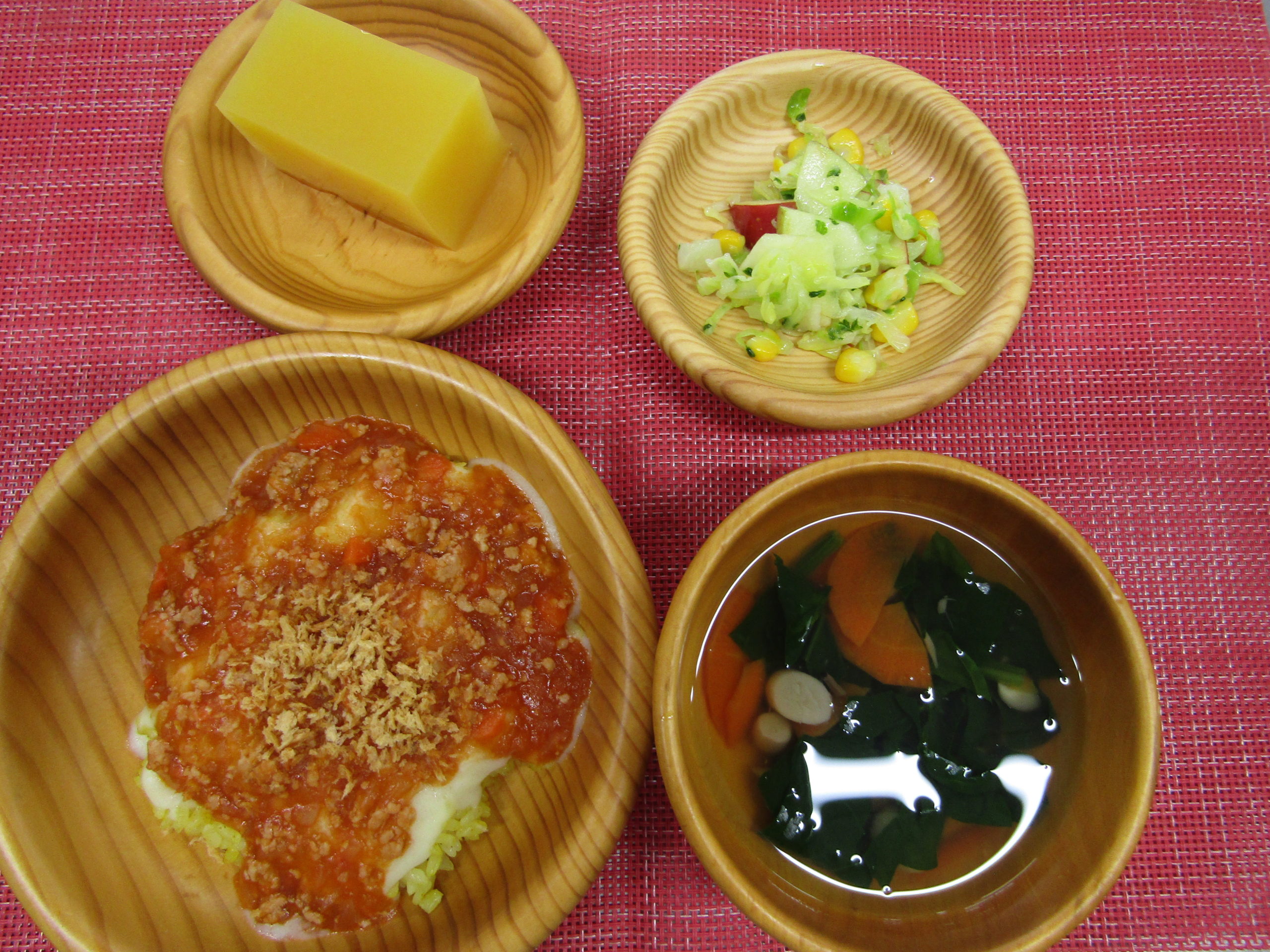 《昼食献立》 ミートドリア ほうれん草としめじのスープ フレンチサラダ みかんかん 《おやつ》 にゅうめん お茶