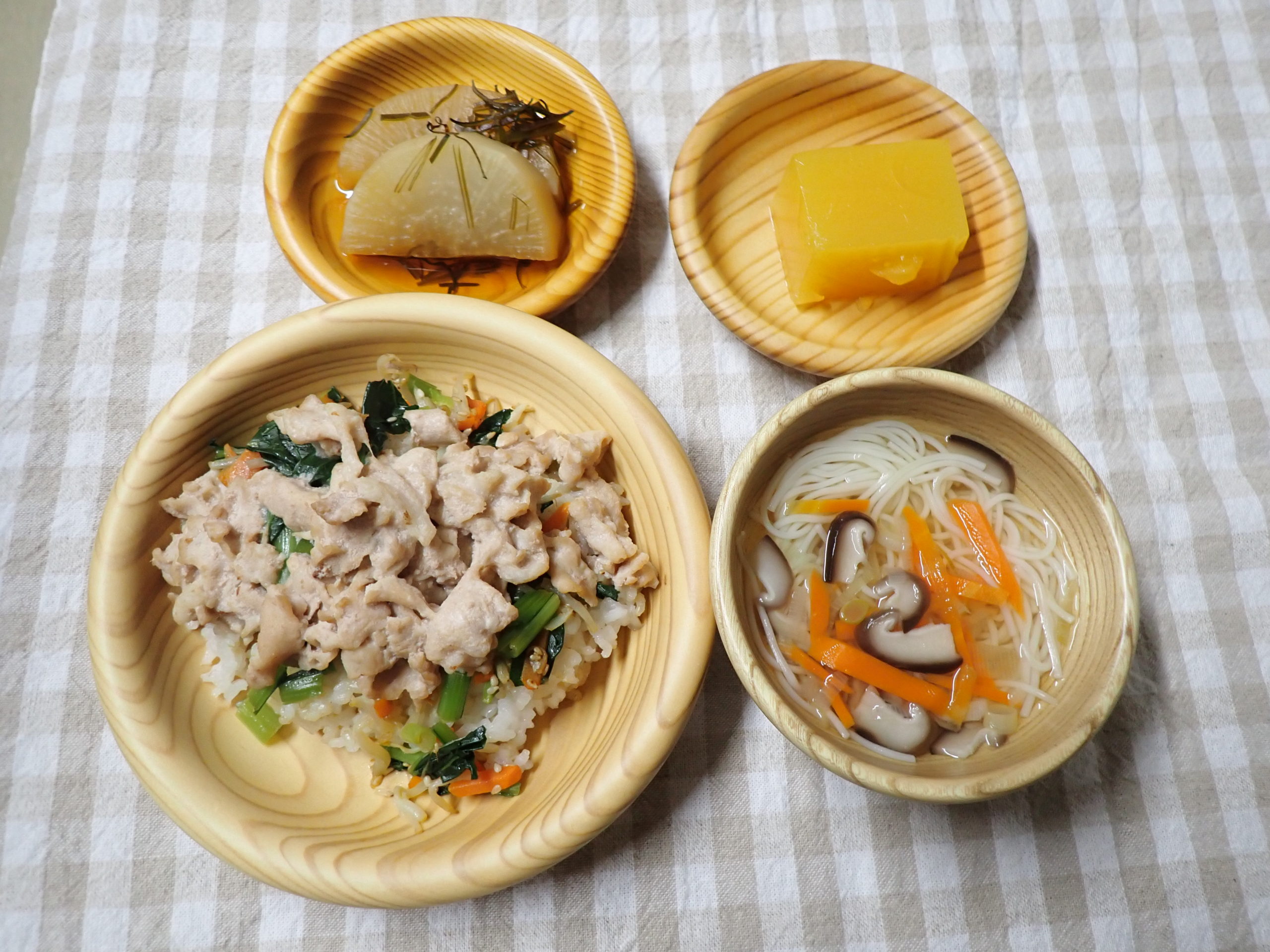 《昼食献立》 ビビンバ丼 そうめん汁 大根と昆布の煮物 みかんかん 《おやつ》 インドサモサ 牛乳