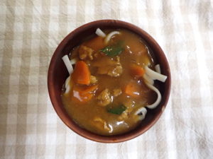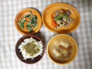 《昼食献立》 ごはん ふりかけ みそ汁(絹ごし豆腐・なめこ・長ねぎ) 筑前煮 しらす和え 《おやつ》 カレーうどん お茶