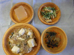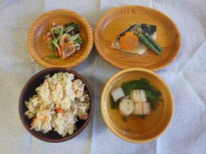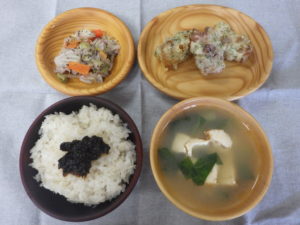 《昼食献立》 ・ご飯/海苔の佃煮 ・みそ汁(厚揚げ・小松菜) ・竹輪の磯辺揚げ ・ゆかり和え 《おやつ》 ・りんごのケーキ ・牛乳