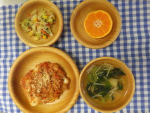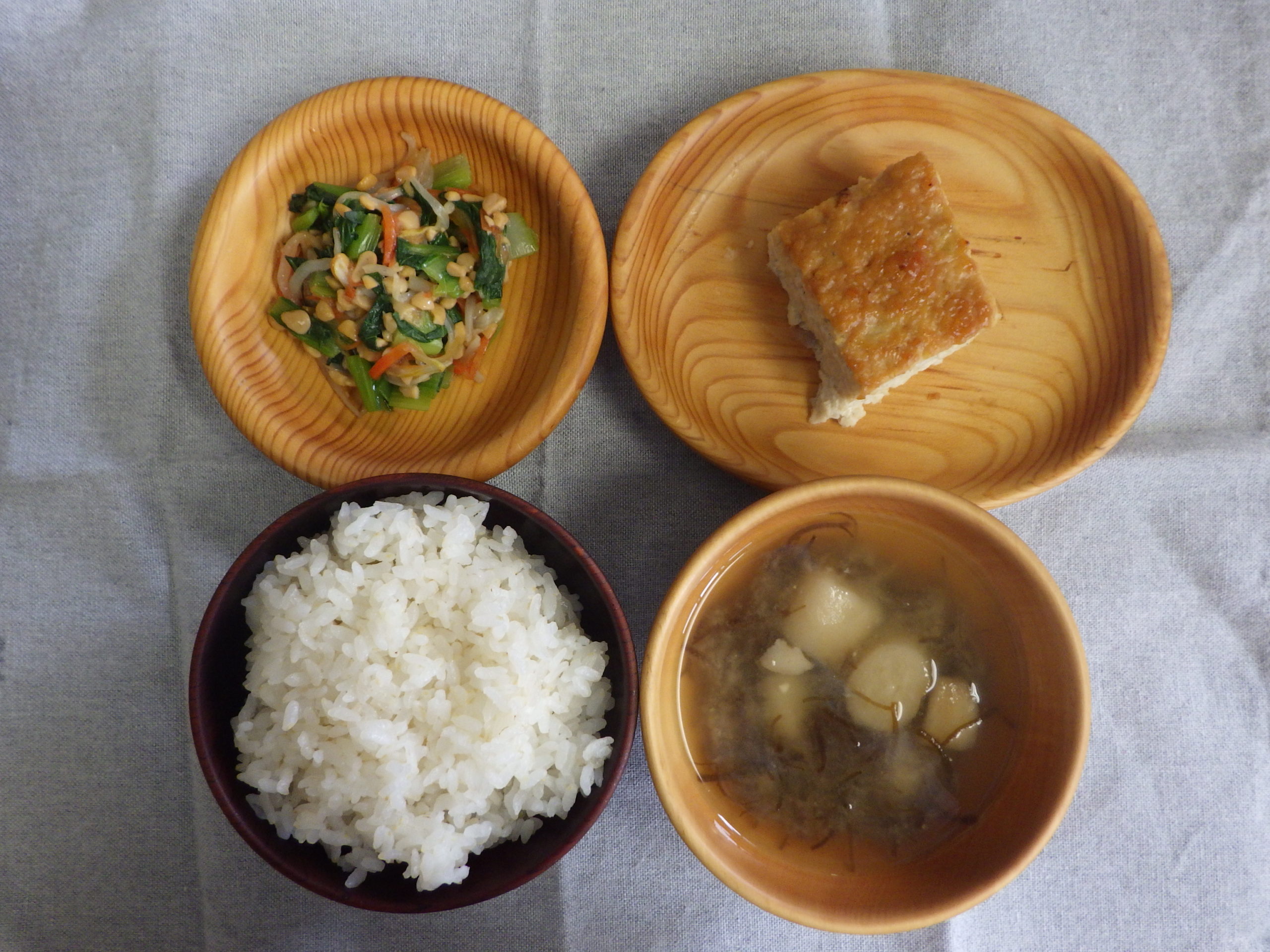 《昼食献立》 ・ご飯 ・みそ汁(焼きふ・もずく) ・豆腐のつくね焼き ・納豆和え 《おやつ》 ・おからの包み揚げ ・牛乳