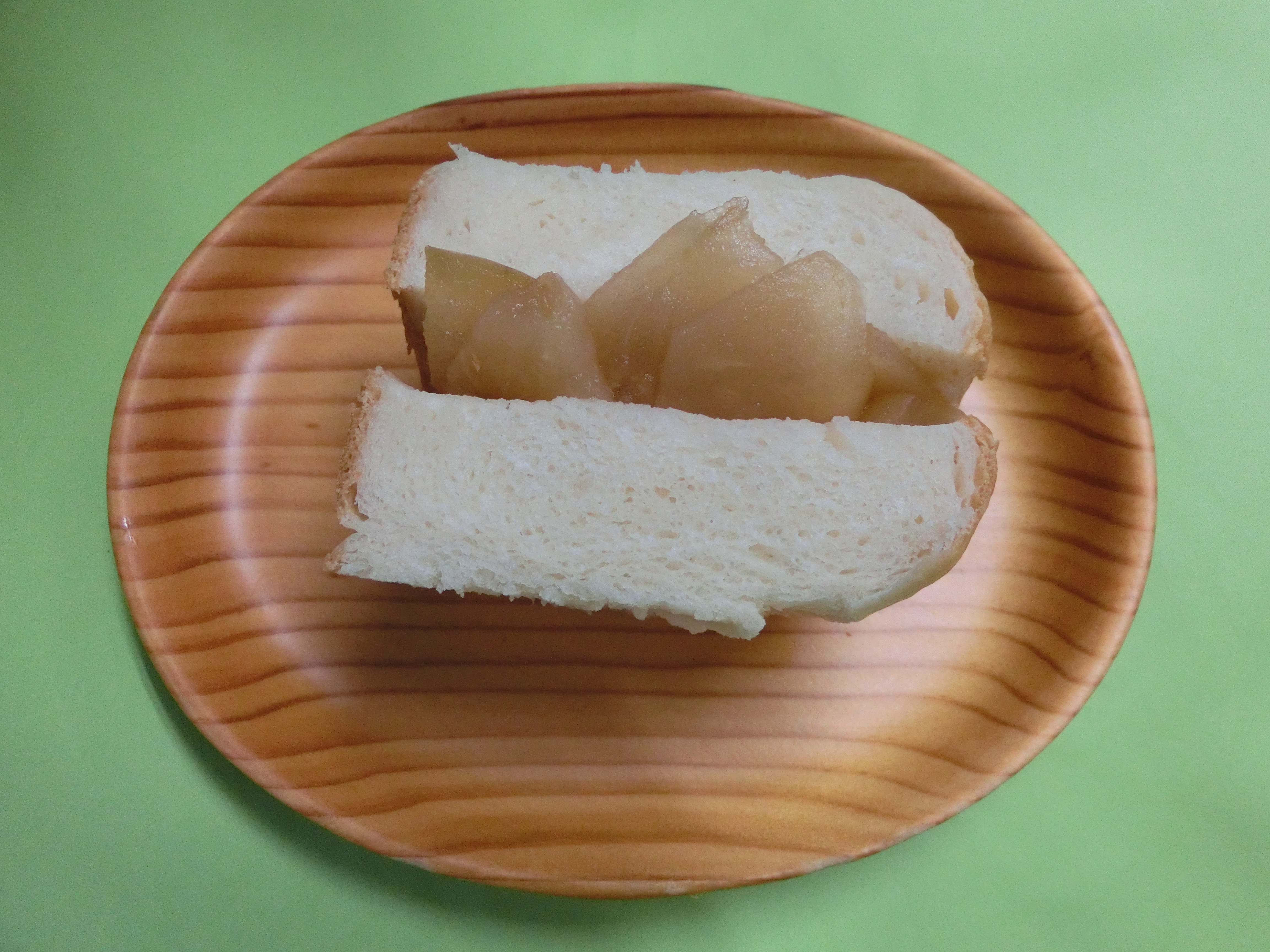 おやつは、手作りリンゴジャムをはさんだ「りんごパン」です。