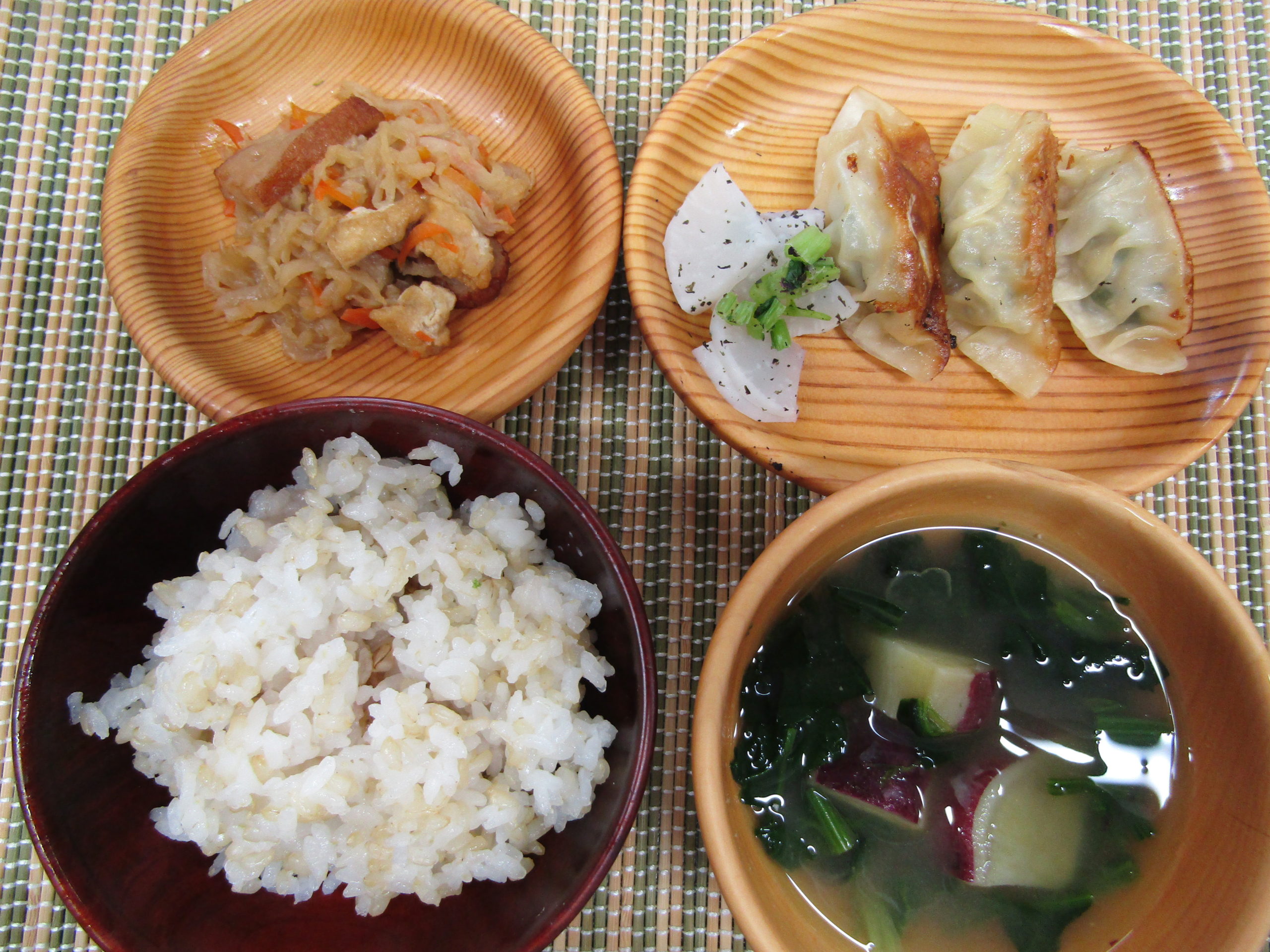 《昼食献立》 玄米入りごはん みそ汁(さつまいも・ほうれん草) 餃子 (付)かぶのゆかり和え 切干大根の炒め煮 《おやつ》 マカロニきな粉 牛乳
