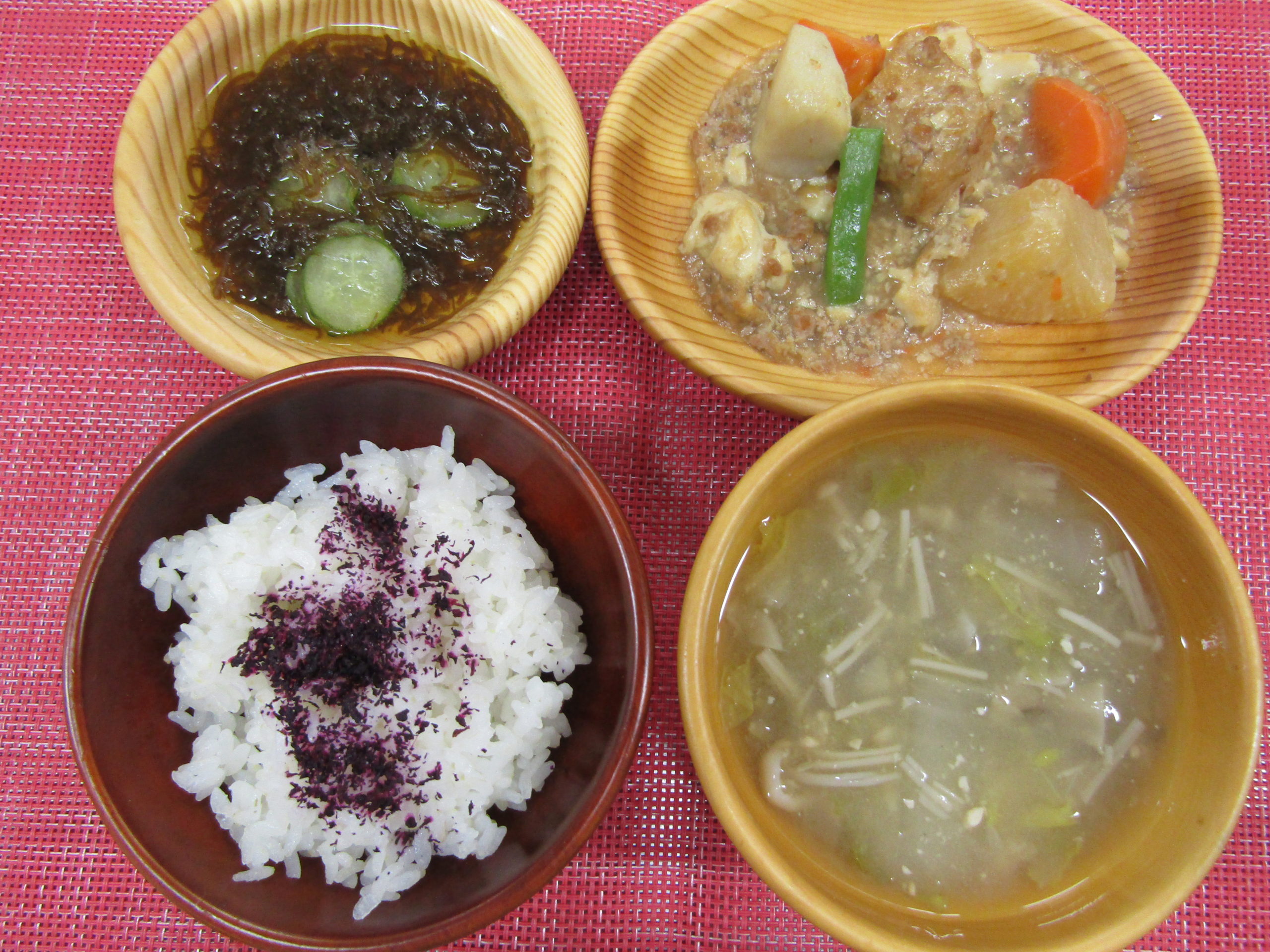 《昼食献立》 ゆかりごはん みそ汁(白菜・舞茸・えのきたけ) 厚揚げと野菜のとろみ煮 もずくの酢の物 《おやつ》 チュロス 牛乳