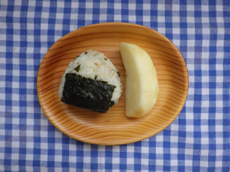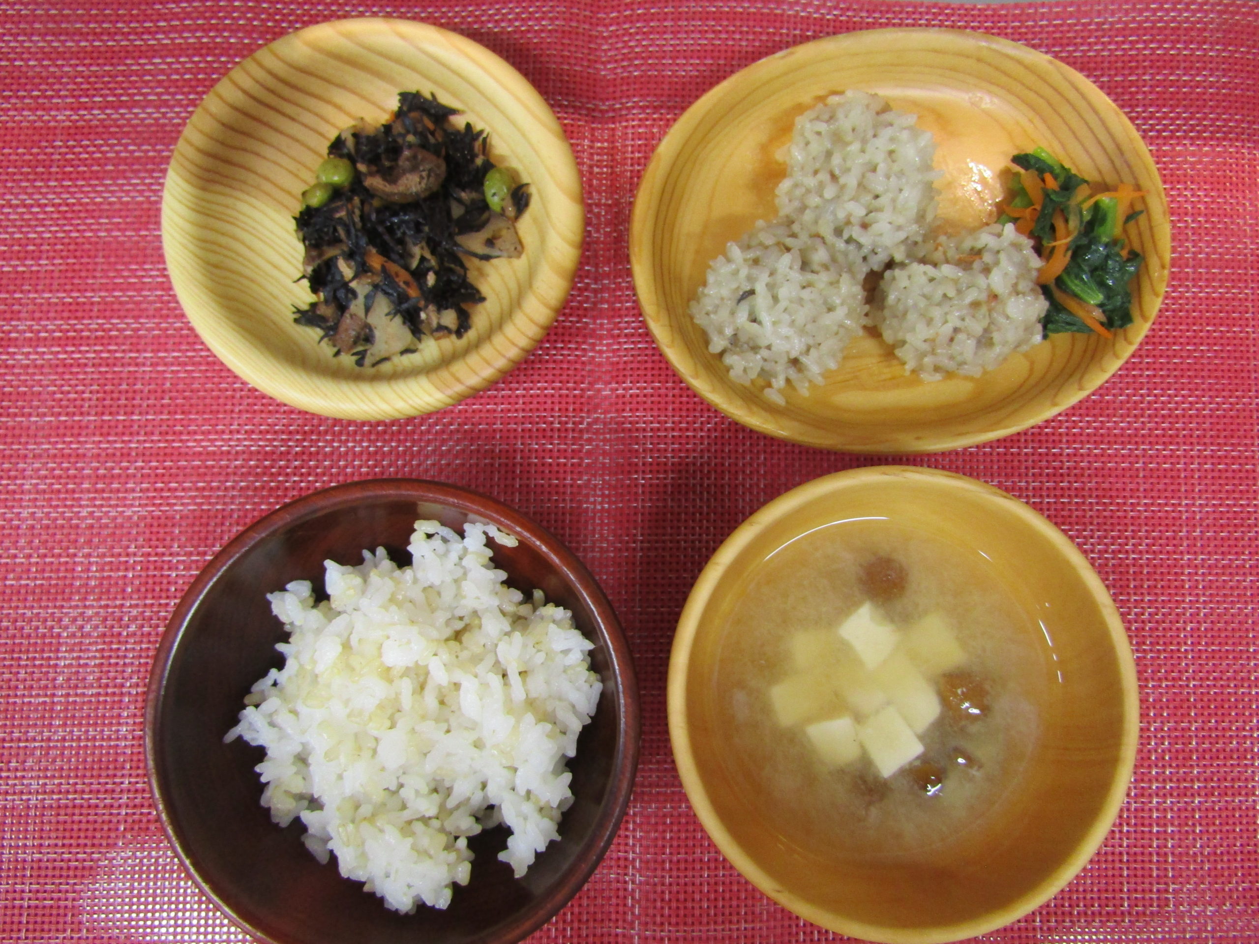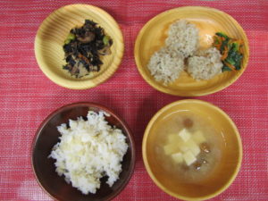 《昼食献立》 玄米入りご飯 みそ汁(白菜・舞茸・えのきたけ) 厚揚げと野菜のとろみ煮 もずくの酢の物 《おやつ》 鮭とわかめのおにぎり りんご お茶