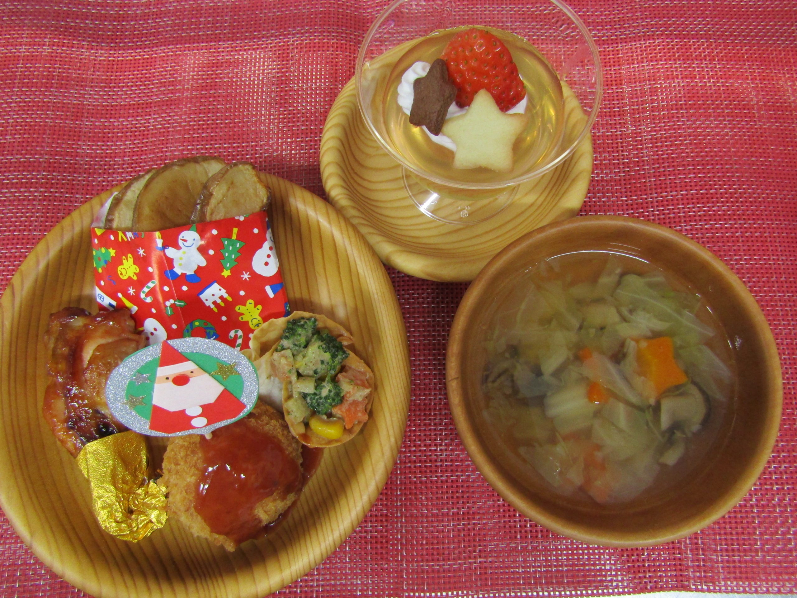 《昼食献立》クリスマス会食 ライスコロッケ (乳児)チキンライス キャベツとしめじのスープ 照り焼きチキン フライドポテト ブロッコリーのサラダ クリスマスゼリー 《おやつ》 にゅうめん お茶