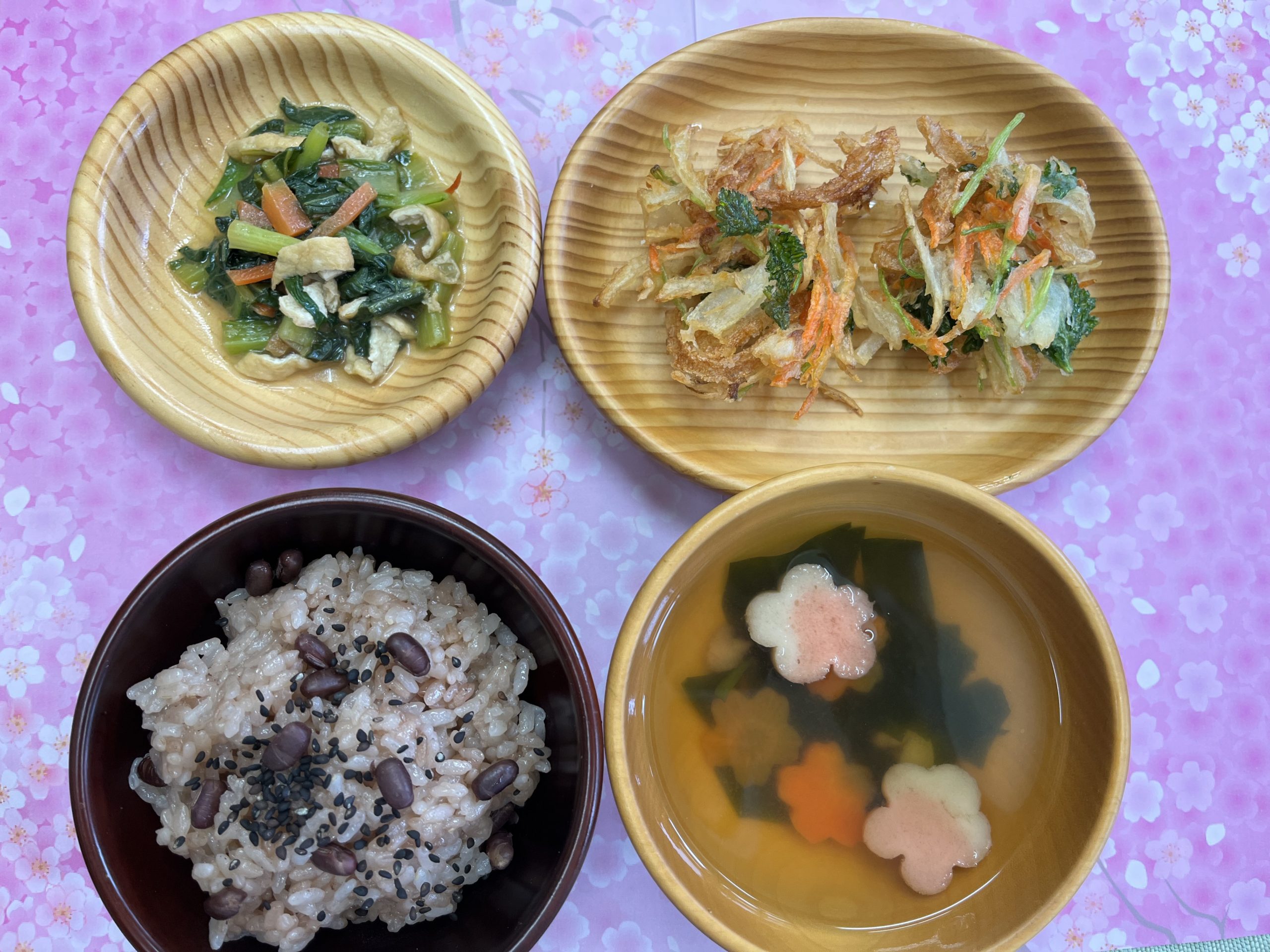≪昼食献立≫ 卒園おめでとうごはん 赤飯 すまし汁(人参・わかめ・花麩) 根菜のかき揚げ 小松菜の煮びたし ≪おやつ≫ 鮭とわかめのおにぎり 菊花みかん お茶