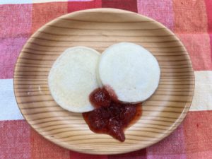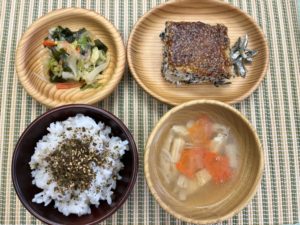 ≪昼食献立≫ 雑穀ご飯 ミネラルふりかけ みそ汁(えのき・人参・油揚げ) ひじき入り照り焼きつくね (付)いりこのサワーオイル漬け 和風和え ≪おやつ≫ 米粉のホットケーキ 手作りいちごジャム 牛乳