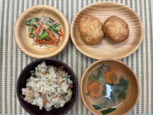 ≪昼食献立≫ せりごはん みそ汁(にら・玉ねぎ・人参) 豆腐の小判揚げ 納豆和え ≪おやつ≫ ジャムサンドパン 牛乳