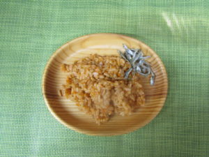 ≪昼食献立≫ 七穀ご飯 みそ汁(しめじ・えのき・ほうれん草) 春野菜のうま煮 パリパリサラダ ≪おやつ≫ カレーピラフ (幼)じゃこ 牛乳