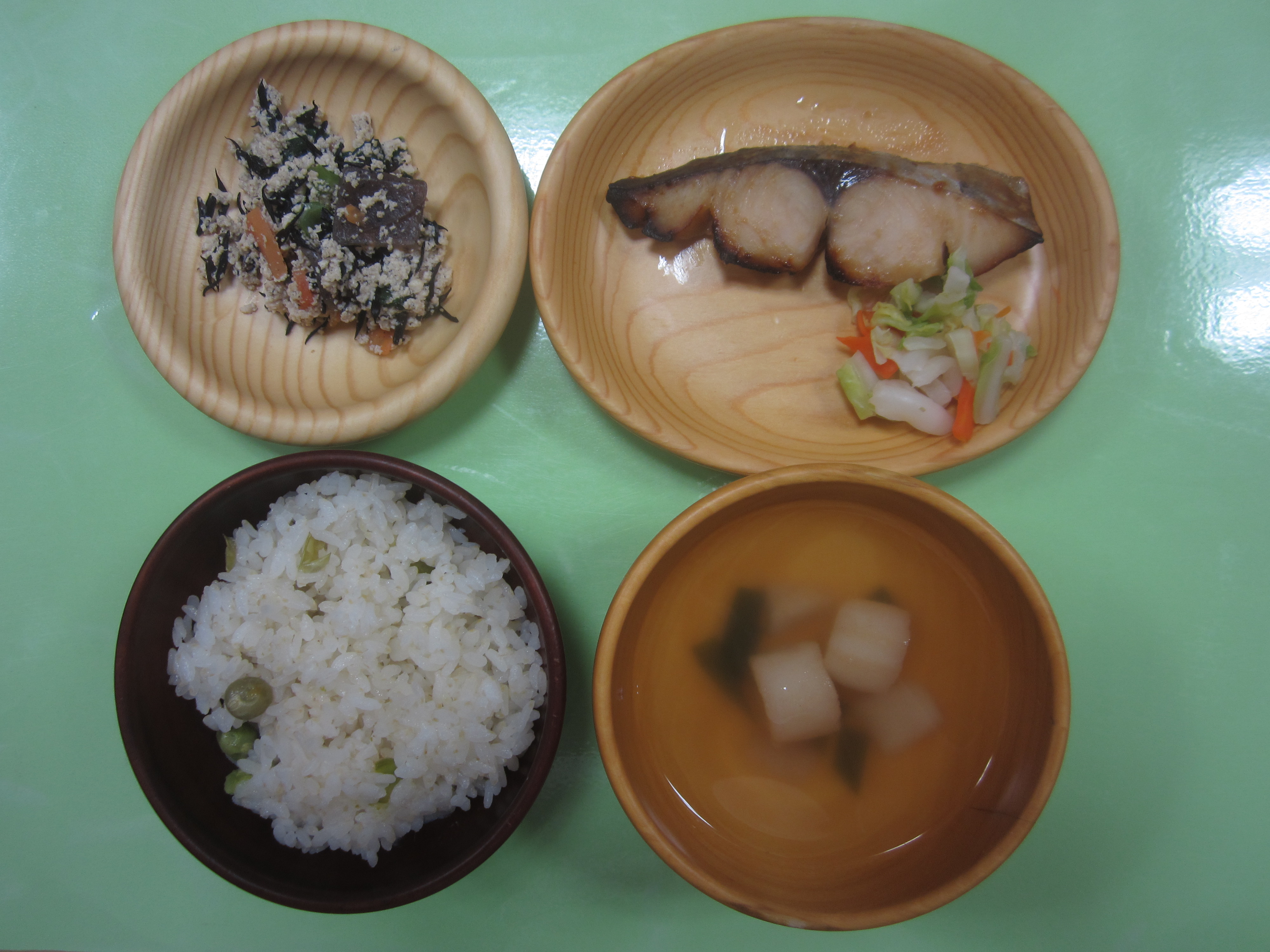 こどもたちが大事に大事にむいたグリンピースを今日はごはんと一緒にふっくら炊きました。