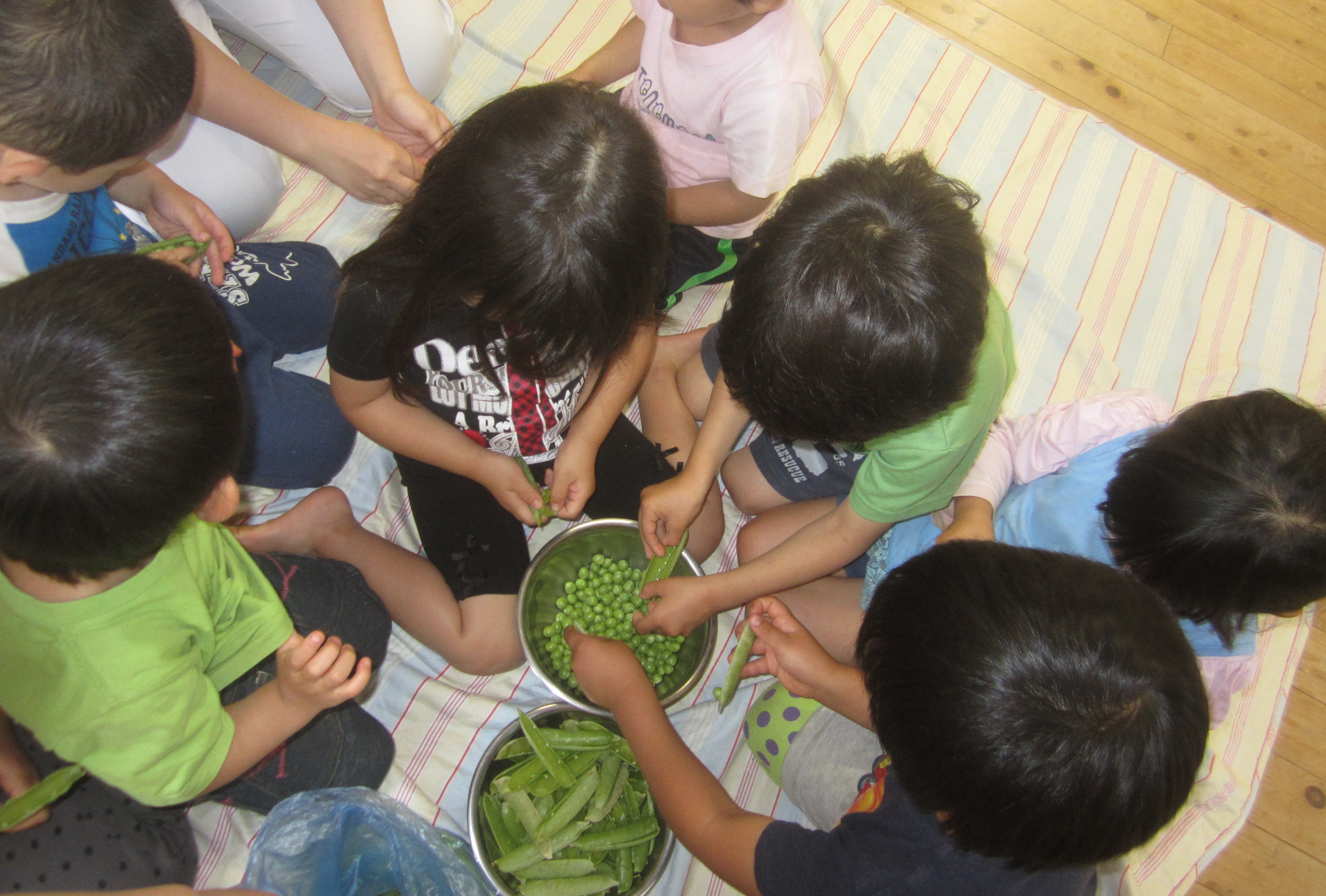 昨日の夕方はこどもたちみんなでグリンピースの鞘とりをしました。