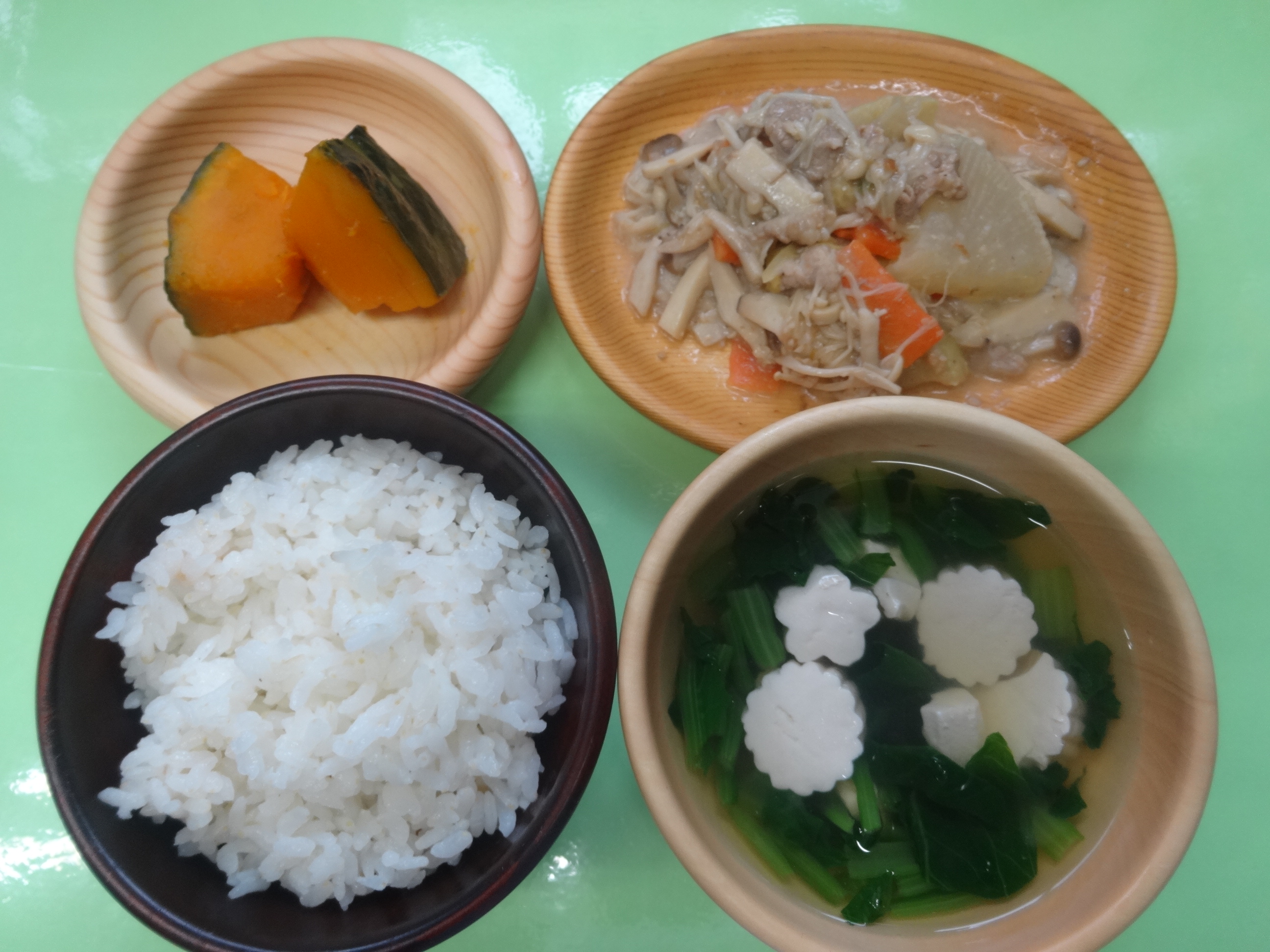 <昼食献立> ごはん すまし汁(絹豆腐、小松菜) きのこのごま味噌炒め かぼちゃの含め煮 <おやつ> すいとん汁 牛乳