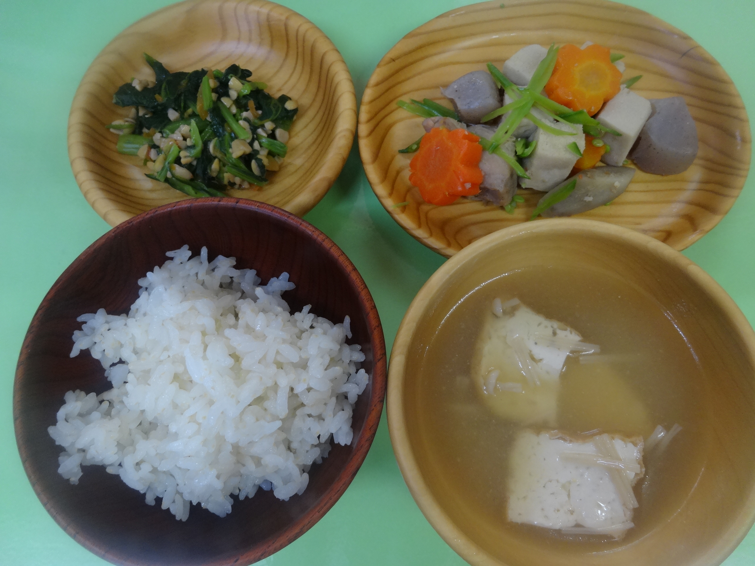 鳩の森らしく子どもたちが食べなれている煮物の和食献立となっています。